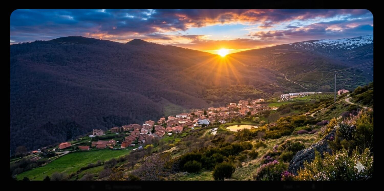 Un Cielo de Cristal: La pureza de nuestro aire permite que los rayos crepusculares bañen el pueblo con una nitidez casi mágica, resaltando cada textura del brezo y la escoba que rodea la villa.